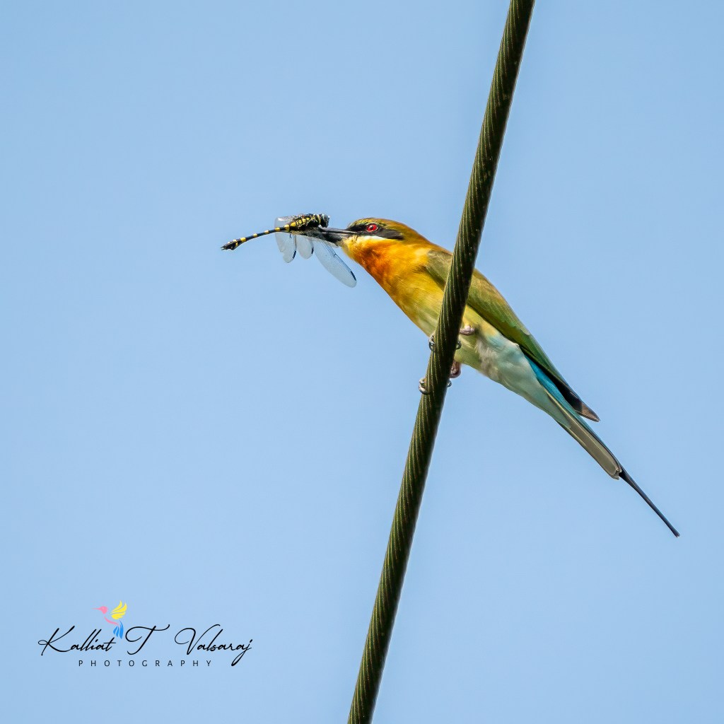The Asian blue-tailed bee-eater, known for its acrobatic skills, can be seen perched on hanging telephone wires and utility poles along water’s edges, catching flying insects.